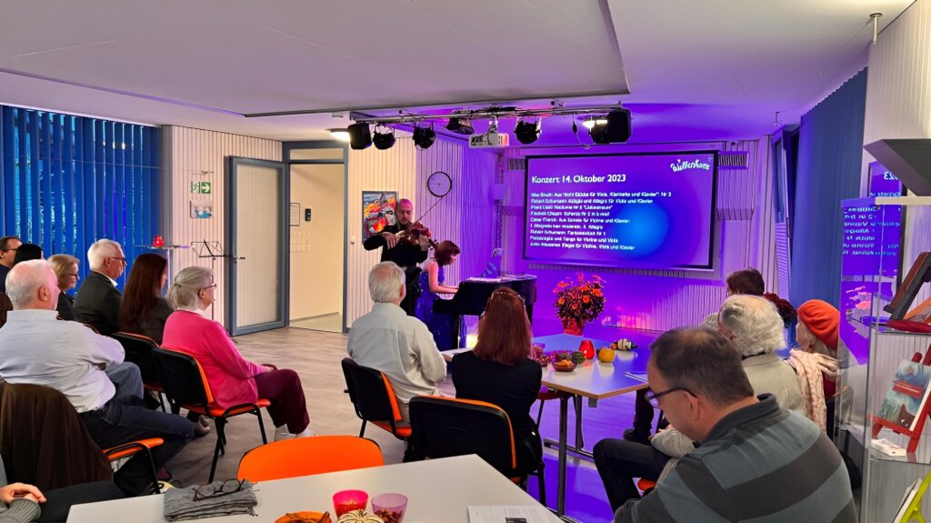 Wellentanz! Ja, welch Freude, am 14. Oktober diesen Raum betreten zu dürfen, geschmackvoll mit Blau- und Rotakzenten, eingetaucht in weiss-violettliches Licht – 30 Gäste hatten den Weg hierher gefunden, um dem ersten öffentlichen Konzert beizuwohnen, welches den Reigen weiterer Veranstaltungen eröffnen soll; erwartungsvoll sassen sie nun auf den fröhlich-orangenen Stühlen.