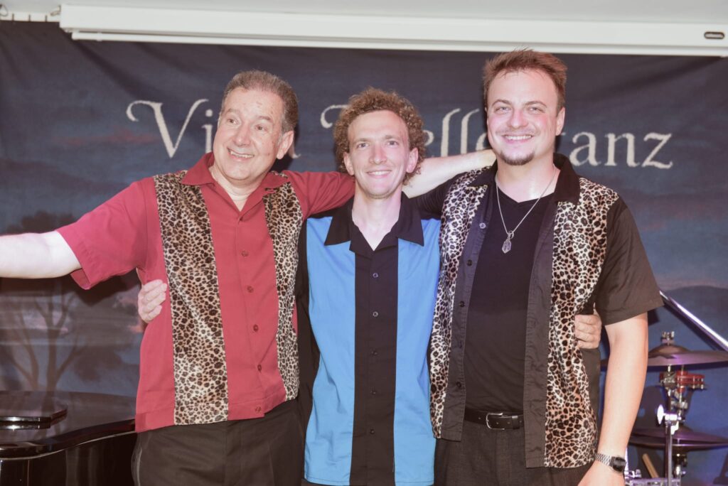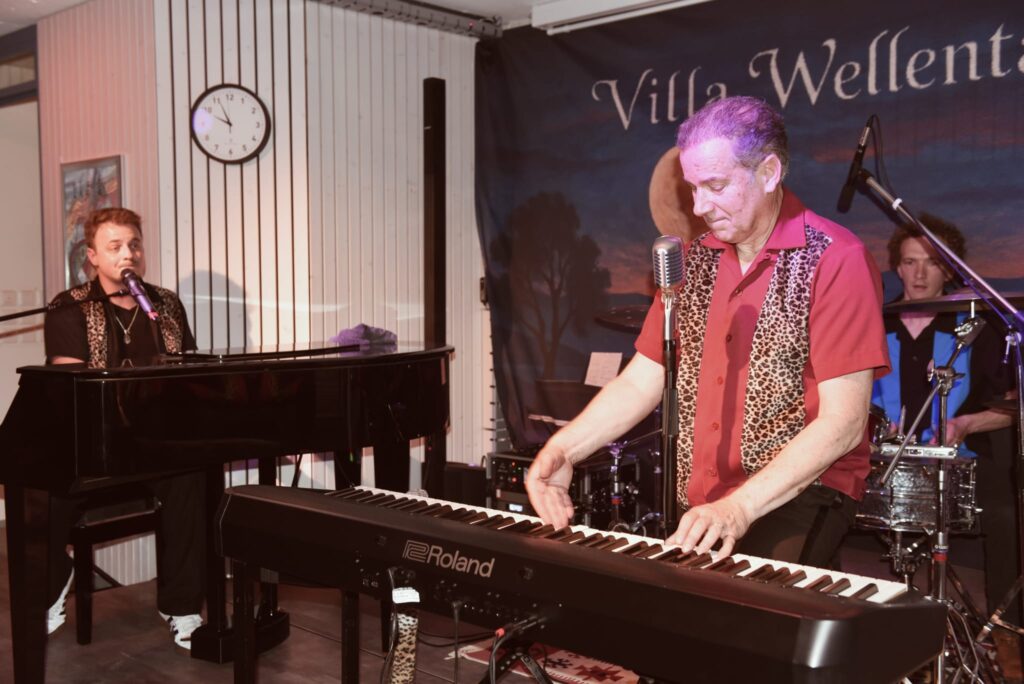 Stammgästen der Villa Wellentanz dürfte Hamp in bester Erinnerung sein, trat er doch bereits am 31. Mai 2024 mit einem musikalischen Feuerwerk auf; damals noch solo, diesmal trat er nun mit zwei ebenso passionierten Mitstreitern auf. 2024 lernte Hamp Lukas Koeninger und Florian Maury kennen und stellte fest, dass sie gemeinsame Interessen haben, insbesondere ihre grosse Liebe zu Jerry Lee Lewis’ Musik. Koeninger, 1989 geboren, wuchs im Tirol auf und brachte sich das Pianospiel selber bei. Die Liebe zog ihn 2015 nach Frankreich, wo er seither lebt und 2017 als Sänger und Pianist international berühmt wurde. Er tourt mit seinem legendären, 300 kg schweren blauen Piano. Mit seinem Idol Jerry Lee Lewis, der von Koeningers erstem Studio-Album begeistert war, kam er 2017 in engem Kontakt. Florian Maury-Buignet lebt ebenfalls in Frankreich und ist nicht nur Musiker, sondern auch ein engagierter Sport-Coach.