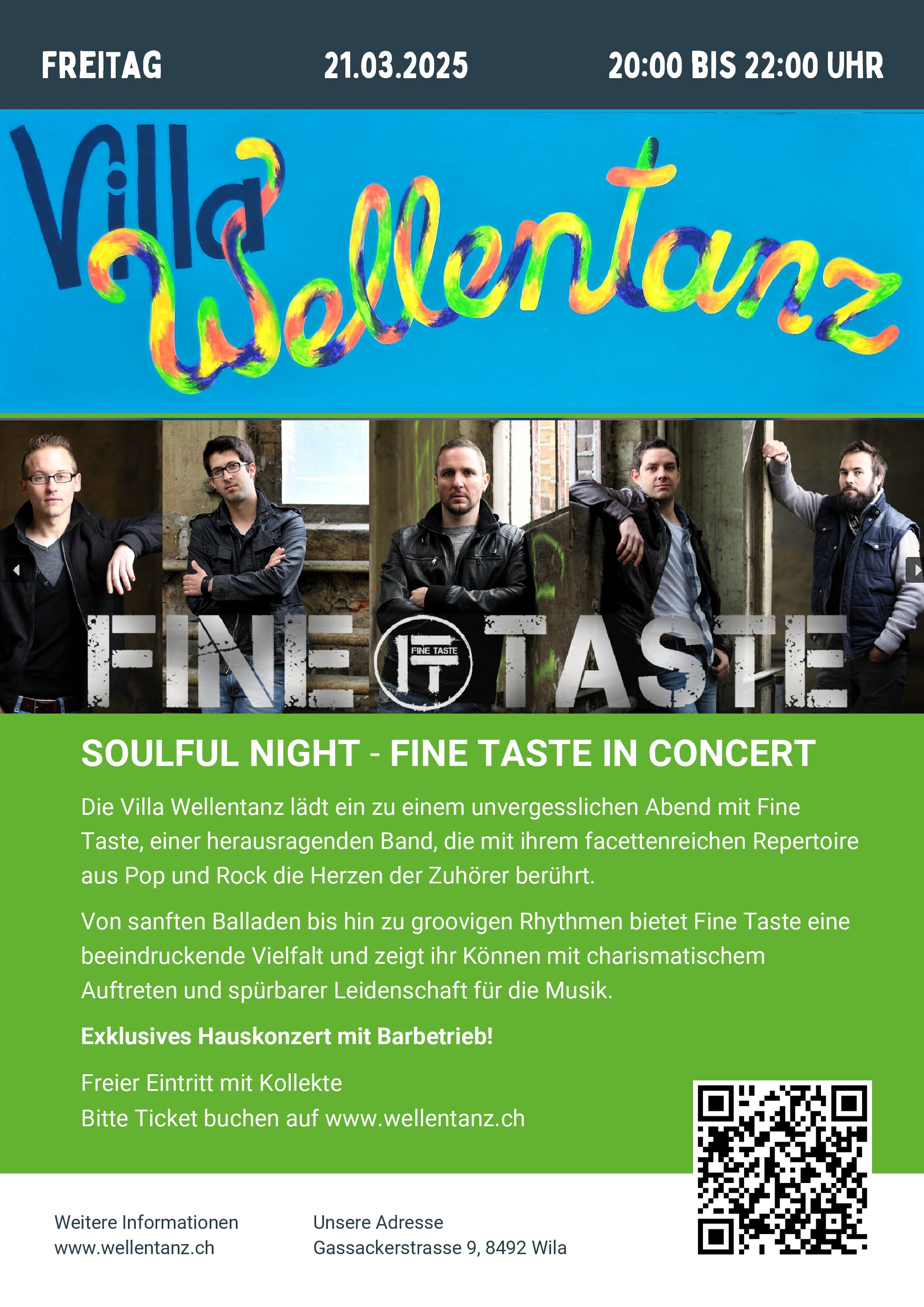 21.03.2025 @ 20:00 – 22:00 – Die Villa Wellentanz lädt ein zu einem unvergesslichen Abend mit Fine Taste, einer herausragenden Band, die mit ihrem facettenreichen Repertoire aus Pop und Rock die Herzen der Zuhörer berührt. Ihre Musik vereint harmonische Nuancen mit musikalischer Raffinesse und sorgt für ein Erlebnis, das lange in Erinnerung bleibt. Von sanften Balladen bis hin zu groovigen Rhythmen […]